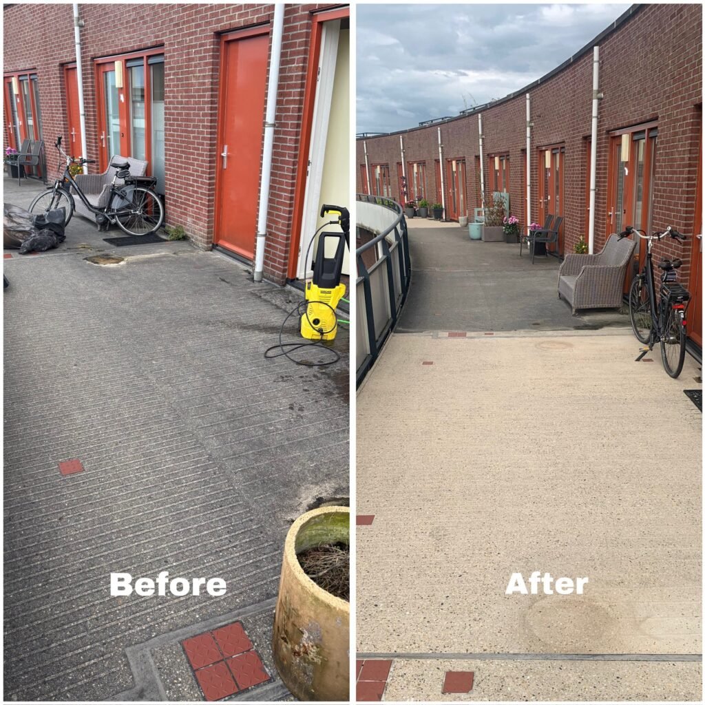 Laat je balkon weer stralen dankzij een grondige hogedrukreiniging. Wij verwijderen vuil, aanslag en groene aanslag tot in de kleinste hoekjes, zodat jouw buitenruimte er weer fris en verzorgd uitziet.